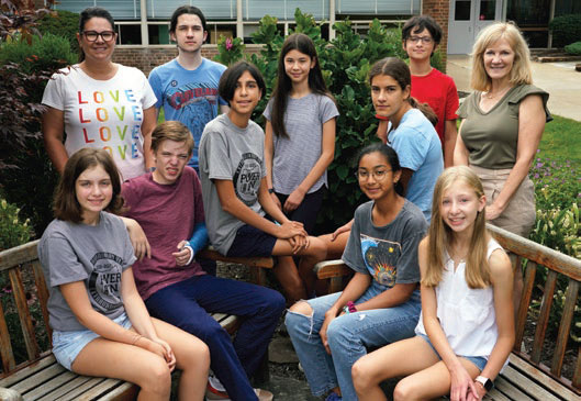 Members of the Shaker Heights Power of the Pen team. Seated, left to right, Isabel Siegel, 8th grade, Asher Voorhees, 9th, Zoe Stiefel, 9th, Anjum Reddy, 9th, Ingrid Holda, 9th, Alexa Carpenter, 8th. Standing, left to right, Erika Pfeiffer, co-advisor, Ezra Ellenbogen, 9th, Neko Tien, 8th, Daniel Carroll, 8th, Sara Lambert, co-advisor.